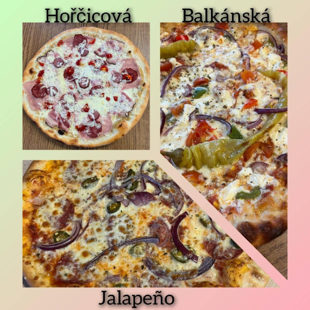 - Tomat, eidam, šunka, klobása, chilli papričky, hermelín, česnek